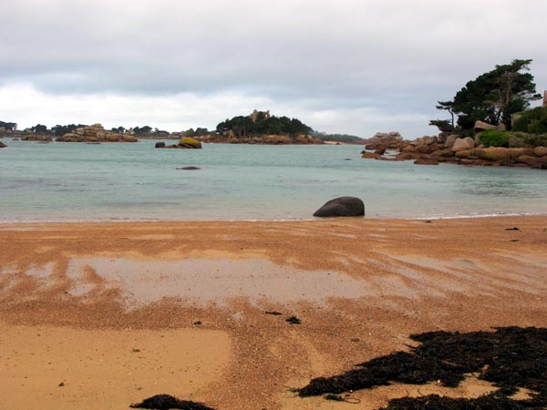La plage ocre de St Guirec face au château de Costaérès sur son îlot.