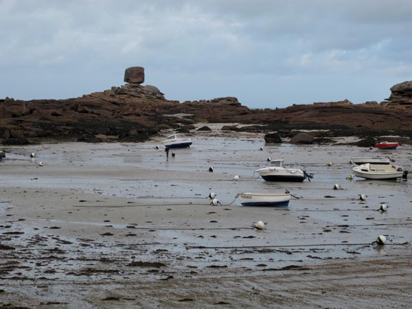 Une partie du port de Trégastel à marée basse, et le roc en équilibre.