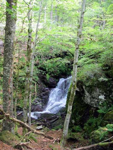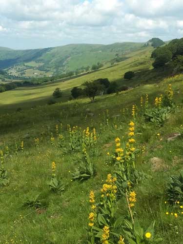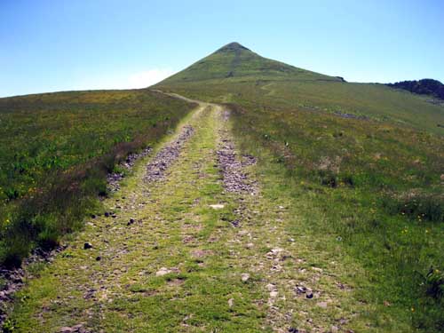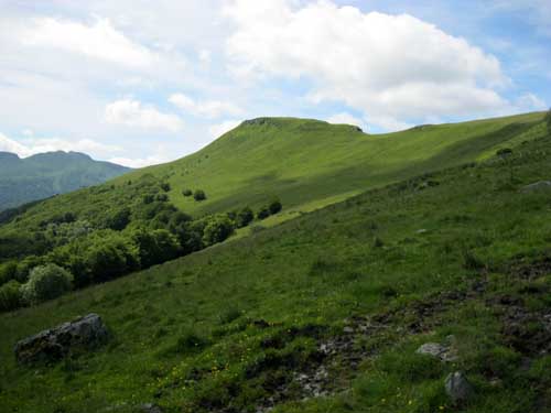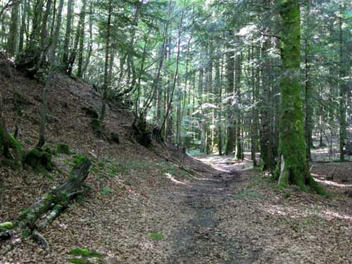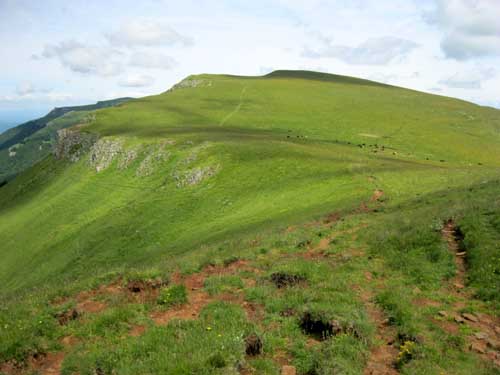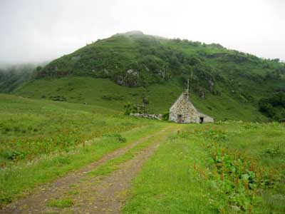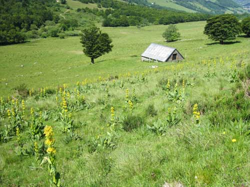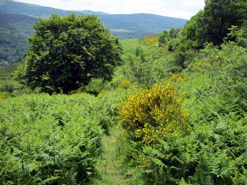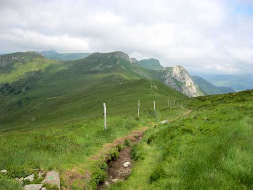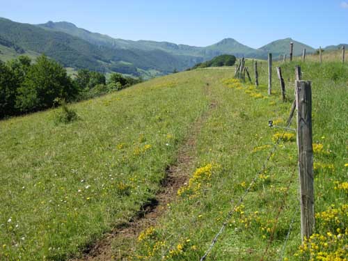La montée est rude par la route et le GR® 400, le soleil chauffe au milieu des champs, mais la fraîcheur se fait sentir en abordant la sombre forêt du Falgoux. Le sentier en zig-zag passe sous des rochers, et continue sur une crête. La descente de l'autre côté dans les champs est assez incertaine : comme hier, il faut chercher les piquets et les marques du GR® ; on aurait tendance à suivre la large piste toute droite, mais en fait, il faut descendre à gauche au milieu des herbes hautes et des gentianes en fleurs. Les balisages sont visibles lorsque l'on est presque dessus! Le terrain devient boueux et vaseux ; même en marchant sur les mottes de terre, l'eau et la boue entre dans les chaussures.