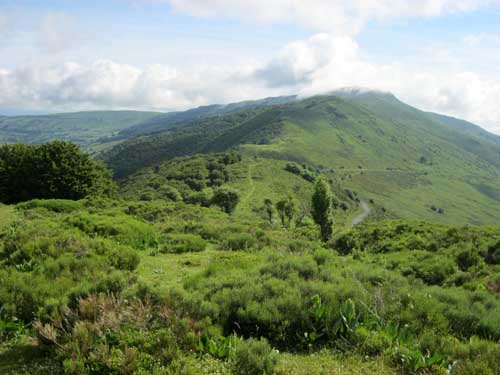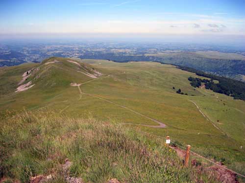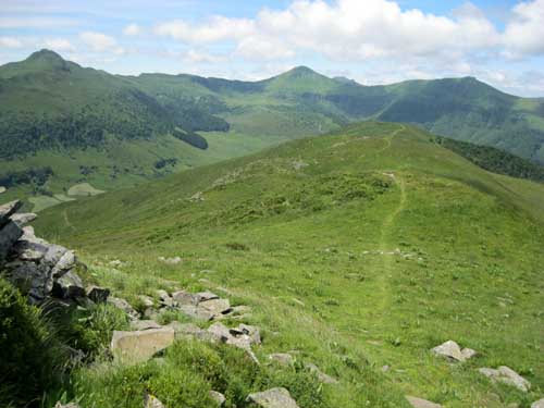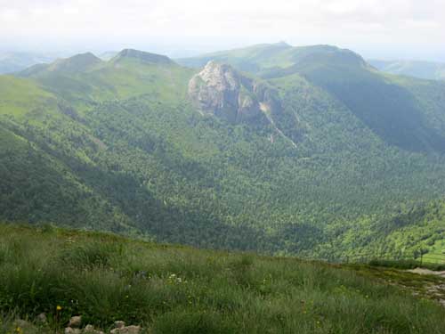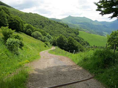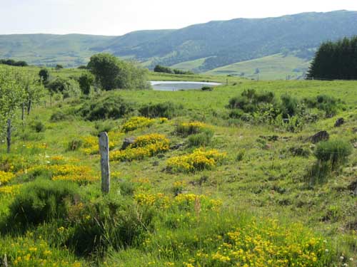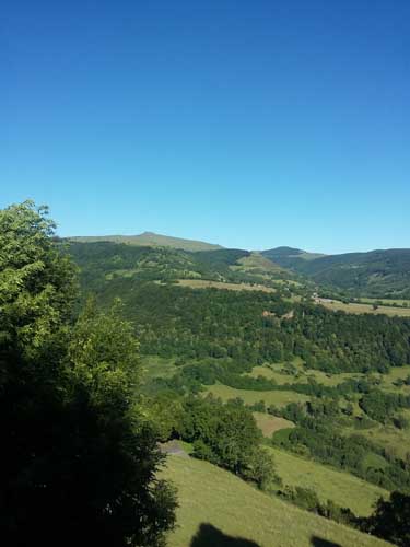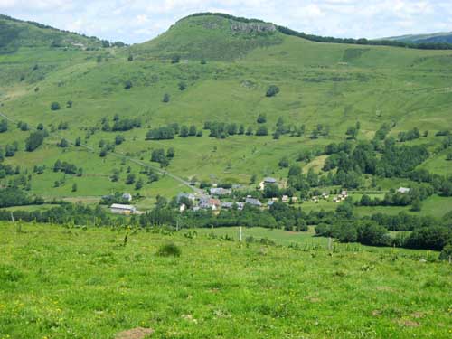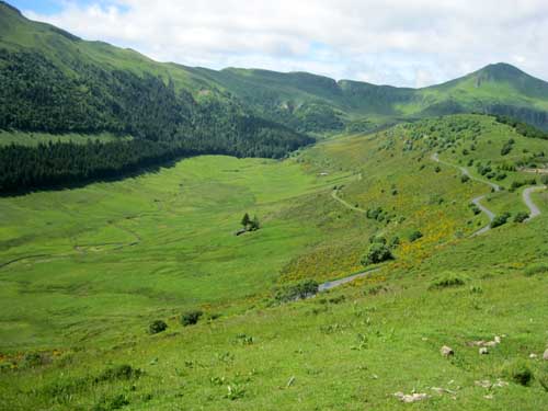 Il faut reprendre la même route qu'hier, dans l'autre sens, direction la ferme du Pied du Sartre. Par une bonne grimpette j'arrive à proximité de l'étang de Lascourt, où je retrouve un peu plus loin le GR® 400, à 9h45 et le chalet des Chaumailloux foyer de ski de fond. Le sentier monte dans le bois de la Grabouse, et des prairies, d'où la vue dégagée permet de voir la vallée et le village du Falgoux ; ensuite le GR® continue entre deux parois rocheuses au Suc Gros.