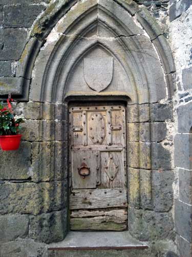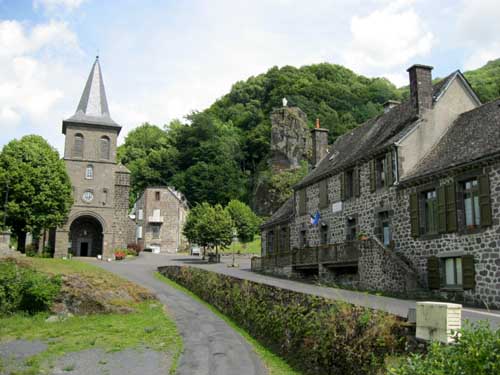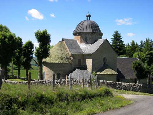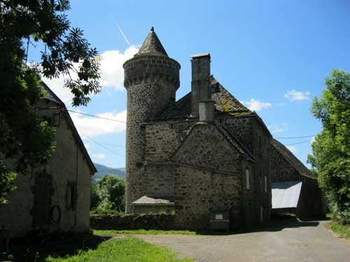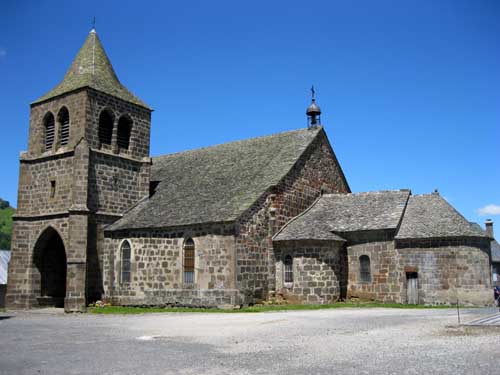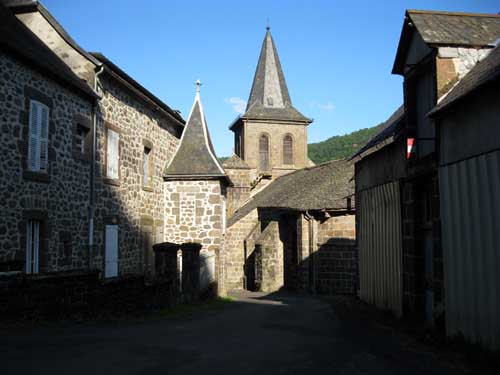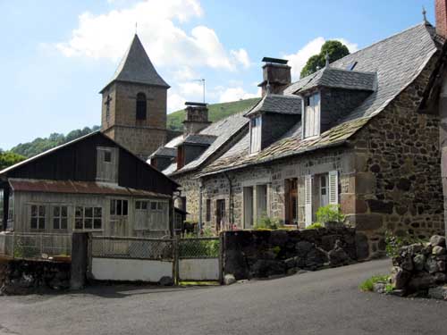 Je continue jusqu'au hameau d'Escorolles, son manoir visible de loin, mais en approchant je constate qu'il est plutôt délabré. Plus loin, j'arrive à Cheylade à 12h50 ; beau village surplombant la vallée de la petite Rhue. L'église romane construite au XIIe siècle, et modifiée au XVe siècle est l'une des plus belles du Cantal.