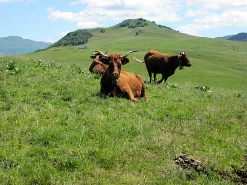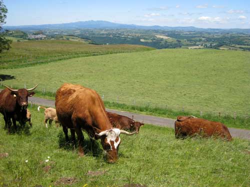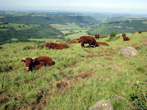 J'ai vite compris qu'il nest pas possible de planter sa tente où on veut! Tout d'abord le bivouac n'est pas toléré dans le Parc Naturel des Volcans d'Auvergne... Ensuite il faut tenir compte de toutes les clôtures, des chicanes, des échelles, des portes de parcs à bestiaux à ouvrir à fermer tous les cent mètres, et quand il n'y avait pas d'ouvertures, j'ai dû me transformer en G.I pour ramper ventre à terre (en ayant soin d'avoir enlever le sac à dos) avec des barbelés qui risquaient de me gratter le dos ou les fesses, pendant que de l'autre côté, de belles rousses à cornes de lyre m'observaient de pieds fermes! Je ne parle même pas de la quantité de bouses de vaches au mètre carré...