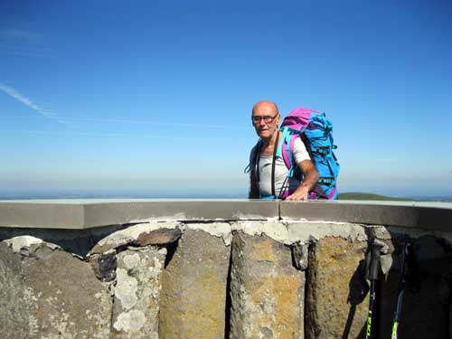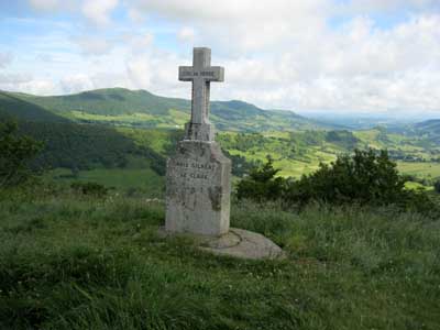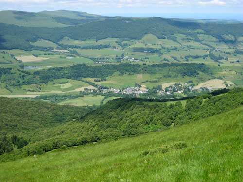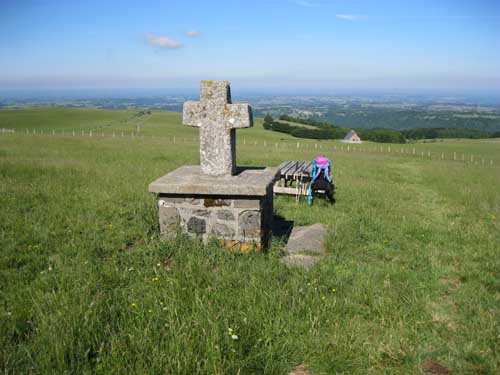 La montée se fait par la petite route en lacets, et les hameaux de Vielmur, et La Roucheyre. Le chemin est différent de ce que j'avais vu en hiver avec les congères et les piquets de clôtures dépassant seulement de quelques centimètres de la neige! J'arrive à la Croix des vachers à 10h15. La vue est très belle sur les vallées, et le village de Salers au loin. Petite pause d'un quart d'heure à la table d'orientation.