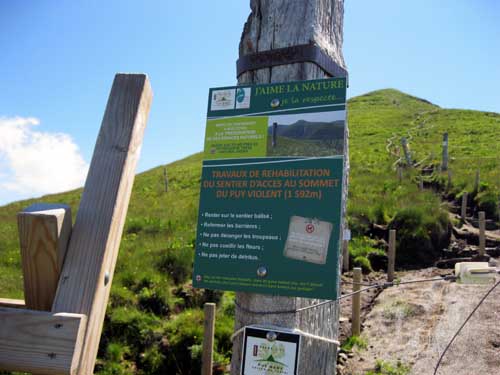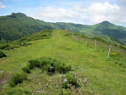 Par moments le Puy Mary est visible, en prenant une direction sud au milieu des champs. Je dois passer mon sac à dos de l'autre côté, et ramper ventre à terre sous des barbelés, lorsqu'il n'y a pas d'ouverture possible! Malgré tout, quelques chicanes et échelles, facilitent le passage par endroits.