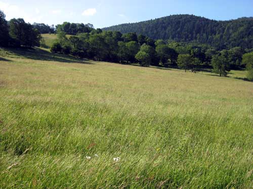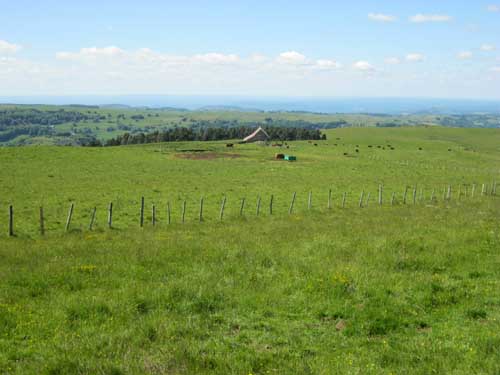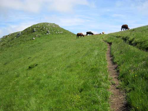 Une étendue arrondie et verdoyante s'étend devant moi, sans clôtures, mais avec des bêtes en liberté... A partir de là il n'y a plus de pistes, mais suivre les piquets très espacés, et guère plus haut que les herbes, ce qui a pour effet de confondre les marques à la peinture avec la flore ; il faut chercher...