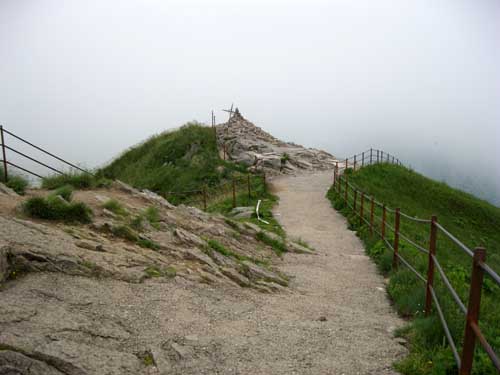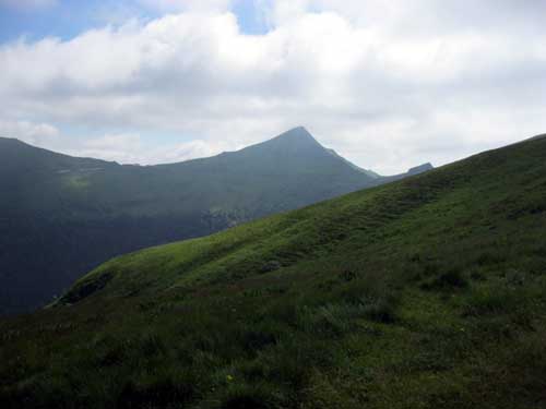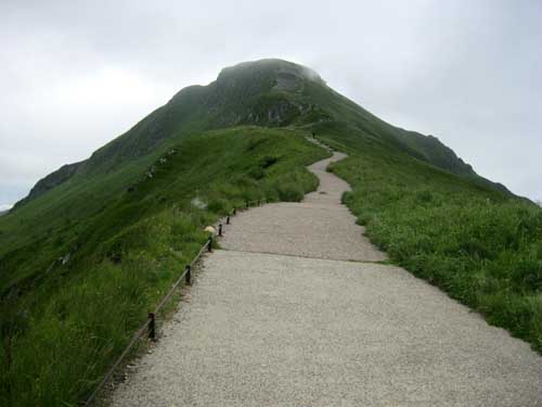 Il est midi et demi. Pause pour déguster à l'auberge une truffade agrémentée de pounti, et tarte myrtilles. J'en sors à 14h30 le ventre plein, et je me sens un peu lourd pour grimper au Puy Mary 1783m. Mais la montée est facilitée par un large chemin bétonné et des larges escaliers. Il y a beaucoup de grisaille et de brouillard, donc peu de monde.