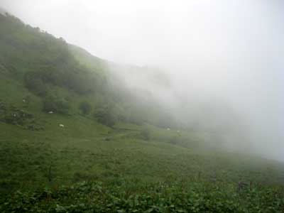 Je perds beaucoup de temps à chercher, et à patauger dans un mélange de boue et de bouse... Il n'est pas possible de bivouaquer sur ces crêtes!