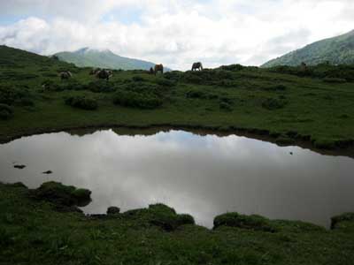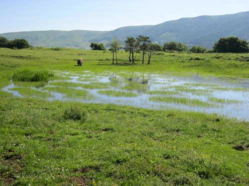 Arrivé en haut, je me retrouve sur un vaste plan d'herbe rase. Cela aurait pu être un très bel emplacement de bivouac ; l'étang de Lascourt est tout proche, mais la présence de chevaux n'est peut être pas l'idéal pour passer la nuit sous tente... Le décor est remarquable : la prairie, l'étang, les plantes aquatiques, les coassements de grenouilles, les chevaux, mais aussi le terrain marécageux aux abords de l'étang.