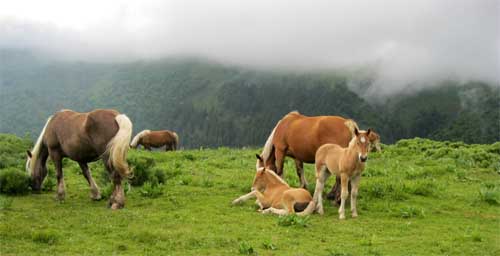 Je voulais passer par la Brêche de Roland, (qui n'a rien à voir avec celle des Pyrénées) pour contourner le Puy de Peyre Arse et passer par le col de Cabre et descendre vers la Gravière, mais tout est bouché par là haut, et vue l'heure tardive, je préfère changer d'itinéraire, en me décidant à partir à 9h25 en suivant le GR® 400 au col d'Eylac ; c'est une vaste piste verte, mais l'hiver piste de ski de fond jusqu'au col de Serre. Des chevaux, des juments, et leurs poulains en liberté, gambadent dans les prés.