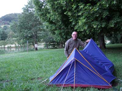 Quelle journée! en partant du Claux ce matin jusqu'à Saint Hippolyte, et faire une boucle pour me retrouver ici!... J'ai mal aux pieds, il est temps de m'arrêter. Après avoir planté ma tente entre le lac et les arbres, je mange, et me couche à 21 heures avec comme compagnons, crapauds, grenouilles, et oiseaux divers. J'aurais préféré une musique pour m'endormir, mais hélas, les coassements et bruits de toutes sortes vont produire un effet contraire...
