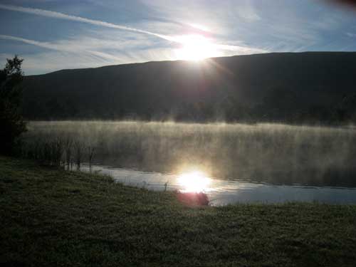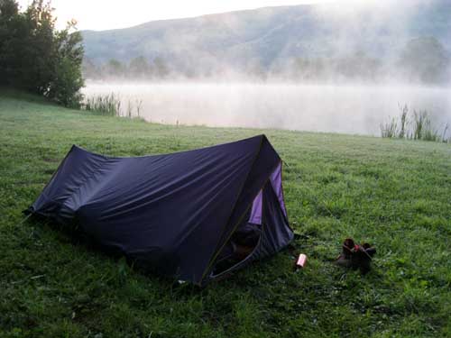 Ma toile transpire ; pas de chaud, mais d'humidité, et le duvet est mouillé! Une brume flotte au dessus du lac, alors que les rayons du soleil s'élèvent doucement au dessus des Plateaux du Limon. J'essaie de faire sécher un peu tout cela, sans m'attarder.