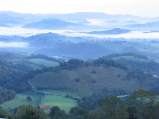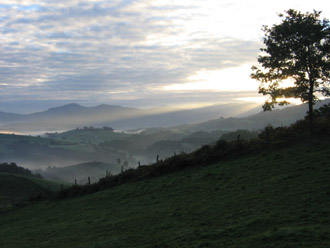 Paysage magnifique et embrumé le matin au départ de St Jean Pied de Port,