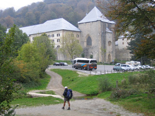 Après la descente du col dans une forêt, le chemin de St Jacques devient "Camino Francés"... ce qui est la même chose, mais maintenant nous sommes en Espagne. Roncesvalles : quelques maisons, un couvent, la collégiale, l'Eglise Santiago, la voûte pour le passage des pèlerins, et le premier grand gîte depuis le départ (un dortoir de 100 places). Nous étions 95, ce 1er octobre à arriver ici sous une pluie battante! Ambiance et promiscuité garantie. Ca fait partie du "Camino"... |