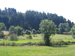 Nous sommes une quinzaine au départ de cette première journée qui s'annonce sous les meilleurs auspices : le beau temps est de la partie. Chemins et routes passent par des villages et hameaux tranquilles. A La Roche, deux jeunes filles à l'ombre d'un auvent, offrent de l'eau citronnée aux pèlerins. Sympathique façon de nous souhaiter bon courage, alors que la chaleur commence à se faire sentir... Les villages de St Christophe sur Dolaison, Ramourouscle, Montbonnet, Le Chier, sont essentiellement agricoles. Nous traversons des champs, des cultures, mais aussi des forêts de chênes, et de pins, avant d'arriver à St Privat d'Allier, où des habitants sur le pas de leur porte nous indiquent, d'un signe, le gîte d'étape avant même que nous le demandions...