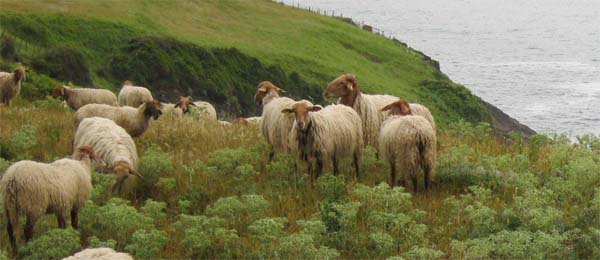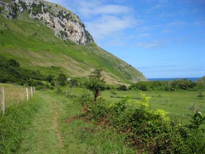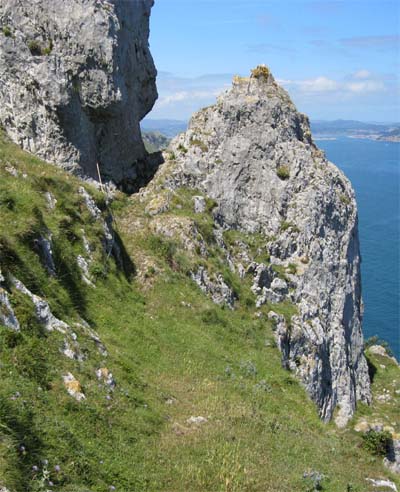 Le sentier traverse des prairies, et ensuite grimpe dans les buissons et les rochers, devient assez aérien une centaine de mètres au dessus des vagues... des passages abruptes, et une main courante dans la roche pour sortir d'un secteur délicat!! Il ne doit pas y avoir beaucoup de monde qui passe par là : ce chemin n'a rien à voir avec le chemin balisé. Mais au moins je ne suis pas sur la route bitumée! La descente de l'autre côté est très raide, et je retrouve enfin des marques blanches et rouges.