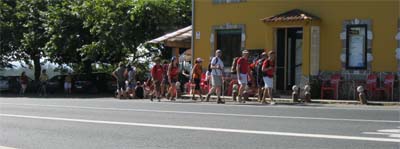 Il y a désormais tellement de monde, qu'il suffit de suivre les autres, au lieu des flèches jaunes! Ce chemin me rappelle 2005, mais à fin octobre il n'y avait personne. Je reconnais seulement certains passages. Pendant cette journée, peu de routes, bien qu'il faille suivre la Nationale un moment, mais sur une piste à l'écart. Le parcours est vallonné sur des chemins forestiers parmi les chênes et les eucalyptus. On sent bien l'approche du but final : non seulement par l'affluence humaine, mais aussi par le nombre de bistrots, et buvettes environ toutes les demi heures en plein chemin! On ne risque pas de mourir de soif... |
