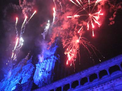 Ce 31 juillet grand concert de Jean-Michel JARRE sur la place de l'Obradoiro pleine à craquer!. Trois heures de spectacle gratuit ininterrompu de musique, lumières, feux d'artifice, etc... des "bonjour, ou merci Santiago", c'est tout? en français ou espagnol, à chaque morceau : le public adore! Tout au moins ceux qui étaient là depuis huit heures du soir, car après 21 heures, tout était barricadé! Impossible d'entrer. On avait le son mais pas l'image! Le public pousse, La police retient... Au bout d'une heure j'ai réussi à m'avancer un peu. Je n'ai vu que l'ombre de l'artiste... mais était-ce le plus important? Le spectacle était autour de nous et en l'air, dans un mélange de musique, jeux de lumières, lasers, projections géantes, pyrotechnie permanente!
