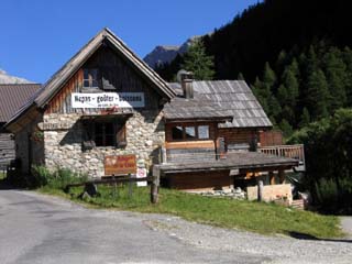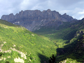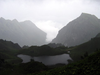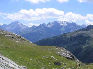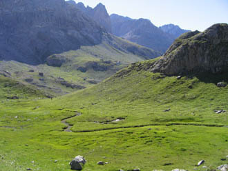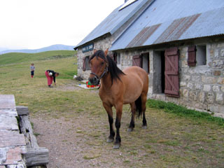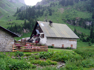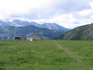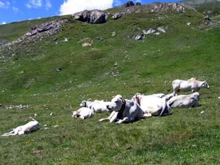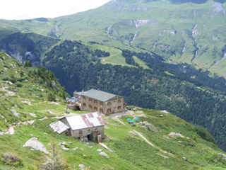 Je remonte par l'autre versant ; il fait très chaud, mais le soleil a disparu! J'espère ne pas encore prendre l'orage aujourd'hui. Le chemin grimpe au milieu de barres rocheuses, et passe par les portes de Longon. Ensuite, les vastes pâturages en pente douce conduisent directement au refuge de Longon à 13 h 40. Je retrouve l'Anglais dévorant une assiette de spaghetti, puis il repart! Jusqu'où? Il ne le sait pas.
