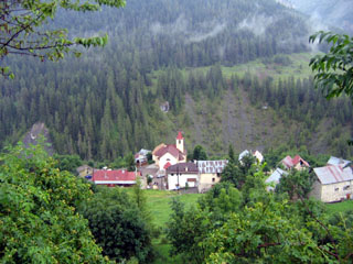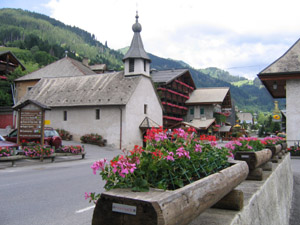 Après le petit déjeuner, je pars à 8h 20 en suivant un groupe de quatre randonneurs. Le sentier est boueux, glissant, avec des traces se perdant au milieu d'une importante végétation, et en finissant dans une forêt de pins et sur la route. Nous parvenons en moins de trois heures à la Chapelle d'Abondance. Je décide de m'arrêter là, alors que les quatre randonneurs continuent plus loin.