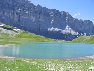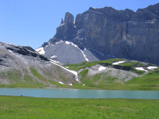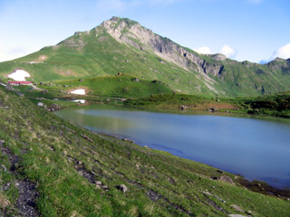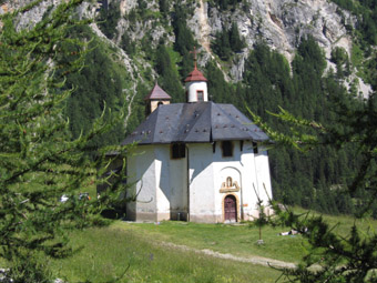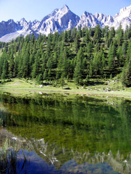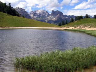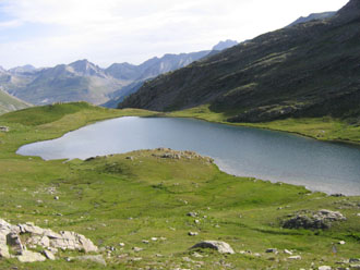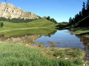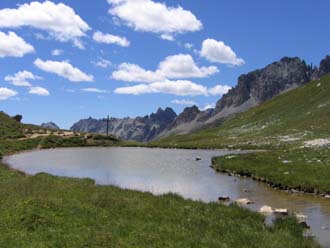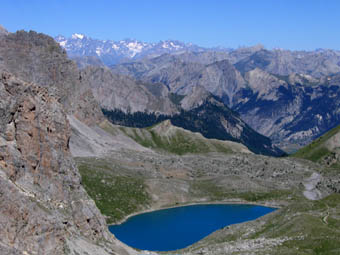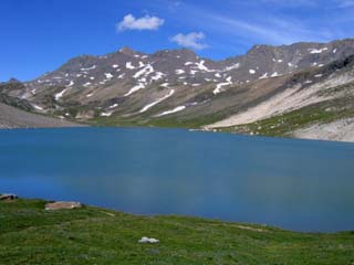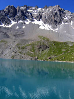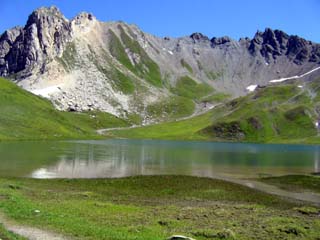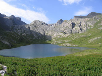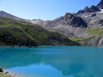 Après avoir longé l'Ubayette, c'est la montée par quelques éboulis et pentes d'herbe, avant d'arriver au merveilleux lac du Lausannier d'un bleu sans ride. A proximité sur une butte de hautes herbes, un petit oratoire domine le vallon. Des randonneurs replient leurs tentes. Un peu plus haut, deux puis trois chamois détalent et semblent faire une course!