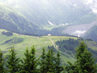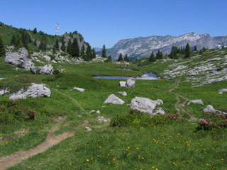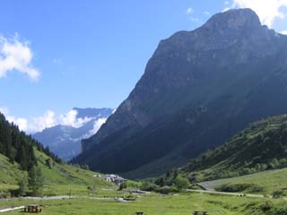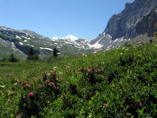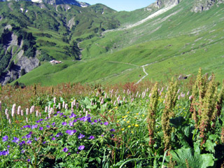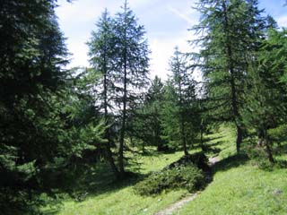 Cette partie est très agréable parmi les rhododendrons et les mélèzes. Un dernier petit raidillon, et me voila arrivé au col de Bassachaux. Il est à peine 13h30. Je retrouve les quatre randonneurs d'hier faisant une pause avant de continuer plus loin. Les patrons du gîte, Mr et Mme CREPY ne sont pas là, mais je connais déjà le gérant remplaçant depuis quelques années.