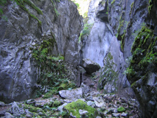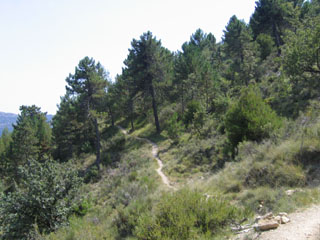 Grande descente caillouteuse qui continue dans la verdure, et même un ruisseau. Il fait très chaud.