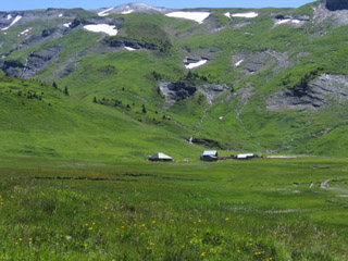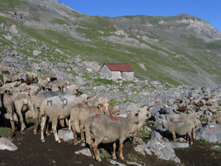 Je rencontre un groupe de randonneurs suisses en pleine pause! Une fois passé le chalet des "Crottes", le sentier se perd dans la boue et les traces de troupeaux. Il faut aller en direction du chalet de la Torrens en pataugeant un peu. Le chien m'accueille en ronchonnant, ce qui fait sortir son maître. - "Vous allez loin"? - "Bassachaux" - "Ah! devrait pas pleuvoir aujourd'hui". Voila une bonne nouvelle!
