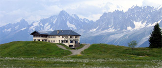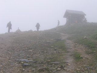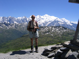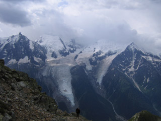 Je traverse tout ce village en longueur, pour reprendre le sentier montant au col de Voza, à travers bois et prairie. Les éclaircies n'auront pas duré : il se met à pleuvoir très fort! J'arrive à mettre ma cape tout seul... En moins de deux heures je suis au Prarion, sommet à 1850 mètres dominant toute la vallée, des Houches à Argentière. En face les aiguilles de Bionnassay et du Goûter. Le reste est enveloppé dans le brouillard et les nuages.