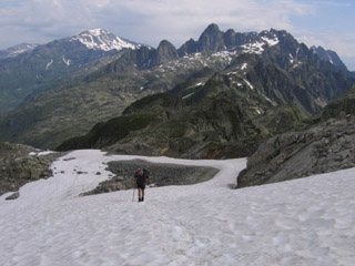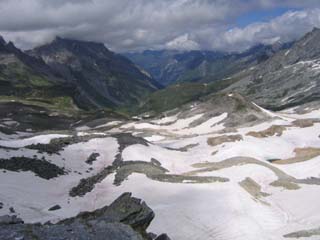 Le soleil arrive à percer quelques nuages, au moment où je repars! Il y a des montées entrecoupées de replats d'éboulis et de pierriers jalonnés de cairns ; avec la grisaille du ciel, le paysage devient lunaire. Plusieurs névés mènent à la dernière pente de schistes pour parvenir au col de Chavière.
