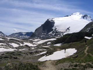 En Savoie on peut éviter Tignes en contournant Val Claret, mais ici il faut traverser la station. Je fais une pause casse croûte à l'autre bout. Le couple de tout à l'heure arrive et continue.