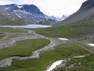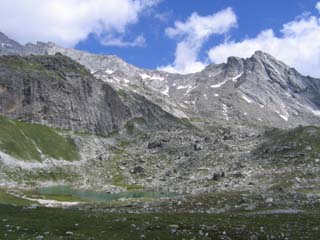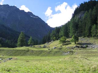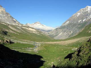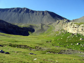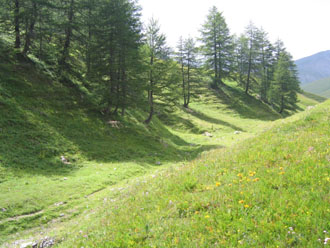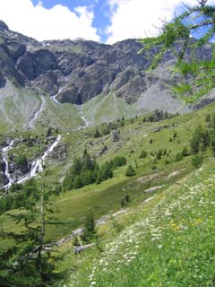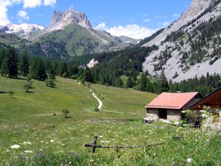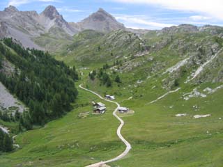 Je quitte Larche à 6 heures et demie. Le ciel est bleu, mais un voile nuageux approche. Après le terrain de camping il faut passer sur la rive gauche de l'Ubayette. La petite route en mauvais état doit souffrir ici aussi des rigoureux hivers. Arrivé au parking, j'entre dans le Parc National du Mercantour. J'ai toujours trouvé cette partie magnifique jusqu'au Pas de la Cavale : l'un des plus beaux paysages du GR® 5. C'est mon avis, mais tout le monde a le droit de ne pas être d'accord. Le sentier longe le très beau vallon du Lausannier. Des dizaines de marmottes ont élu domicile ici, et creusé leur terrier au bord du chemin ; certaines, assises sur leur derrière, sifflent et s'enfuient dans leur trou, comme par jeu! Les prairies sont vastes, les bergeries et granges sont dispersées. Quelques arbres, des bouquets de conifères, et le torrent, composent ce décor de carte postale.