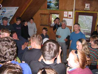 Dire que ce refuge est sommaire, est un euphémisme! L'eau est à l'abreuvoir à l'extérieur, ainsi qu'un seul WC à 50 mètres. Très pratique lorsqu'il pleut, et que chacun attend son tour! "Le clou", si je puis dire, c'est les trois pitons vissés dans le plafond au dessus du poêle à bois et sur lesquels, avec des cintres en fil de fer, chacun suspend ses fringues trempées, et comme il n'y a pas assez de place tout autour de la seule source de chaleur du refuge, nous sommes une soixantaine à étaler nos petites affaires un peu partout dans le dortoir. Ca commence à sentir bon le refuge!