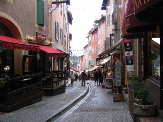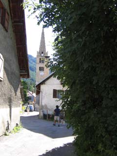 On retrouve plus loin un chemin à peu près potable, pour rejoindre Roure, village accroché à flanc de montagne. Des escaliers, une ruelle pavée, une calade entre les maisons, mène au sentier qui coupe plusieurs fois la route, et arrive dans la vallée à St Sauveur sur Tinée. Il n'y a pas grand chose dans ce village, à part la boulangerie qui vend aussi des fruits!... une épicerie et deux bistrots. Il est seulement 10h45, je fais une pause casse croûte d'une heure. Il fait très chaud, mais déjà le ciel se couvre.