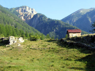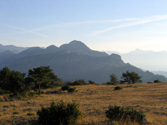 Je quitte St Dalmas à 7 heures et demie, par une raide montée à travers bois, menant au premier col de la journée : le col de Varaire à 8 h 20. La montée continue pour atteindre le col des deux Caïres. Le ciel est bleu à l'horizon vers le sud, mais à l'est et au nord, les nuages empêchent le soleil de sortir! Le sentier en balcon avec vue plongeante dans la vallée, passe sous la crête du Gros Caïre. Passage à un col avec un panneau : Baisse de la Combe. Il faut contourner le Mont Tournairet, et descendre par une très belle forêt de sapins et des clairières. Des cloches et sonnailles de vaches se font entendre : le troupeau n'est pas loin. Je passe aux Granges de la Brasque : bâtiments abandonnés, dont certains sont en ruines!
