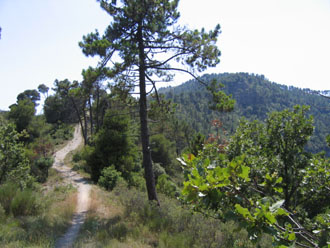 La petite route mène au col d'Andrion, où je retrouve un sentier en descente à travers bois. Il y a d'importants travaux forestiers, des arbres abattus et des branches coupées avant d'arriver au col des Fournès.