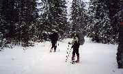 traverse un petit bois. Delphine et Hervé raquettes aux pieds sont devant comme