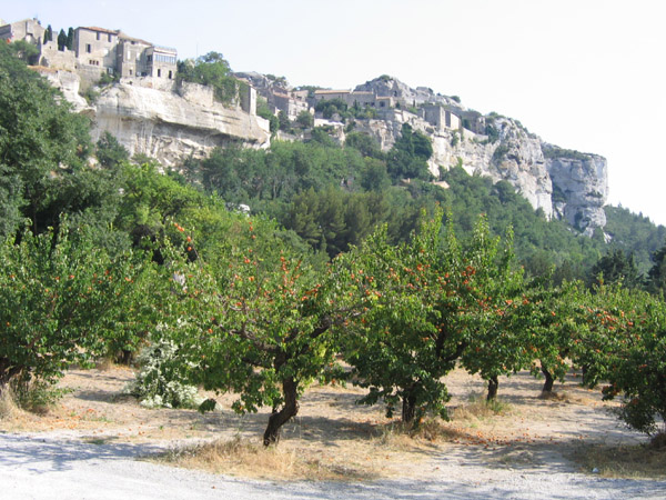 Les Baux sur l'éperon rocheux, et les vergers d'abricotiers à l'entée du Val d'Enfer.