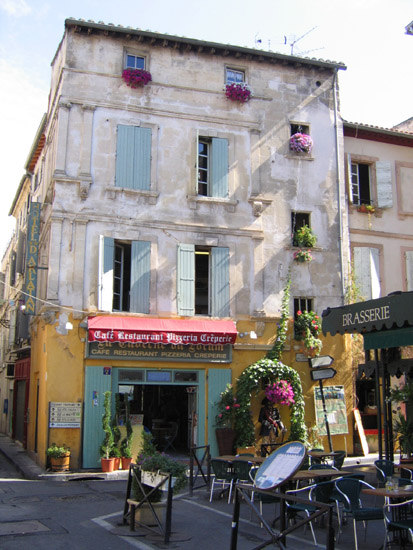 Une façade sur la place du Forum, et les nombreux bistrots ;