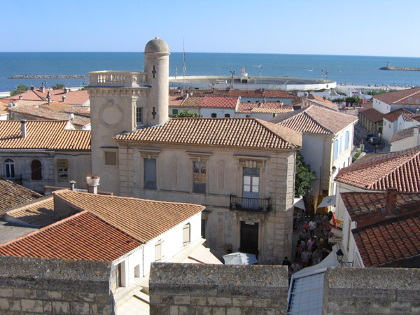 Vue depuis le toit de l'Eglise : le musée, les arènes, la mer.