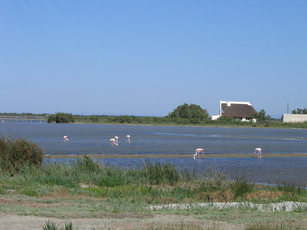 Les flamands roses au bord d'un étang, et la cabane de gardian.