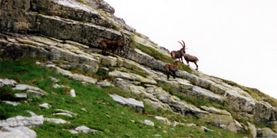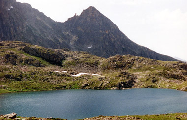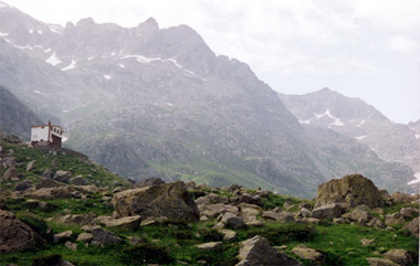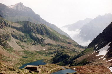 Le chemin surplombe le lac del Vei del Bouc. La dernière pente est très raide, dans des schistes glissants : courbé en avant j’ai l’impression de monter à quatre pattes. Je ne connais pas la signification de ce col : « del Vei del Bouc » mais en tous cas, des bouquetins sont là, impassibles, venant de tous côtés, ils semblent émerger des nappes de brouillard qui s’effilochent. Je suis bien content d’être arrivé ici en moins de temps qu’indiquait le panneau à San Giacomo. Derrière moi, le sentier se dessine dans la grisaille cotonneuse. Les sommets sont masqués : une ligne horizontale les coupe. On ne distingue pas les hauteurs. Devant, c’est bien la même chose. Le sentier n’est plus balisé, les traces sont peu visibles : je distingue au loin une échancrure, qui pourrait ressembler au col des Sablons. Avec la carte, j’essaie de me repérer. Il y a encore des bouquetins blottis, immobiles contre une paroi, peut-être transis de froid : en effet, la température n’est pas élevée. Un peu plus bas je retrouve une sente descendant vers un petit lac. Je suis sur la bonne voie. il faut remonter vers un ancien blockhaus, pour atteindre le col frontière des Sablons. |