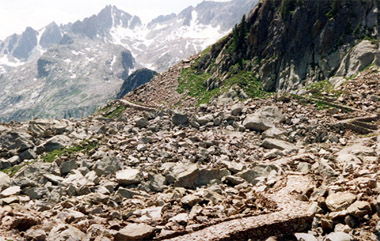Les jeunes qui marchaient derrière moi, font une "pause romantique ! " Je continue, espérant trouver les lacs Jumeaux, dont on parle tant. Un petit sentier longe un ruisseau, au milieu de la verdure. Cet endroit me semble plus beau que le reste du vallon, et la vallée des Merveilles de l’autre côté.
