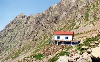 Aussitôt levé, en regardant par la fenêtre du dortoir, je m’aperçois que tout est gris dehors ! On y voit rien. Ca promet ! Il faut retourner au croisement des chemins passés hier, et aborder la montée dans les éboulis. Des chamois bondissent de blocs en blocs en me voyant. Parfois, j’aimerais grimper aussi aisément. En attendant, le ciel se dégage petit à petit. Une fois au col di Fenestrelle, la vue sur la vallée est libre, l’Argentera est dégagée. La cime du Gelas côté italien, flotte sur les nuages. La descente est assez rapide, et sans difficulté j’arrive au bas du vallon. Légère remontée pour accéder au refuge Soria. Derrière, dans le prolongement : le col de Fenestre communique avec la France et la Madone de Fenestre. Petite pause café au refuge Soria, pour demander au gardien des nouvelles du chemin montant au refuge Pagari. Il paraît que c’est très enneigé, et le petit glacier à traverser nécessite piolet et crampons. Dommage ! Je ne suis pas équipé pour çà : j’aurais aimé être à 2650 mètres pour mon anniversaire.