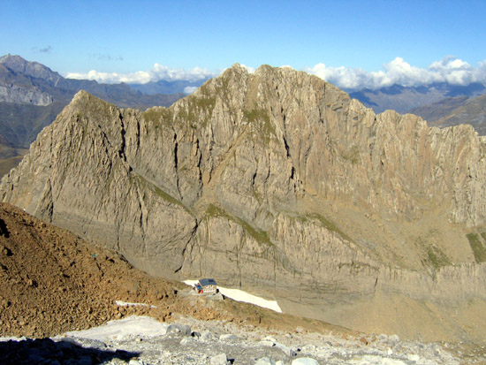 Le Pic des Sarradets, et le refuge vus du glacier.