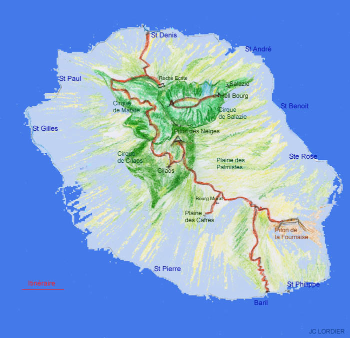 - St Denis à la Plaine des Chicots - Plaine des Chicots à Aurère (cirque de Mafate) - Aurère à Marla (cirque de Mafate) - Marla à Cilaos (cirque de Cilaos) - Cilaos à la Caverne Dufour (Piton des Neiges) - Caverne Dufour à Bourg Murat (Plaine des Cafres) - Bourg Murat au Gîte du Volcan (Piton de la Fournaise) - Gîte du Volcan au Baril ( St Philippe) - Hellbourg, et le Piton d'Enchaing (cirque de Salazie) |