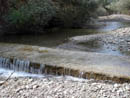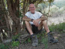 Nous suivons ce fameux ruisseau en contrebas du hameau, en enjambant les pierres dans l'eau ou en suivant une trace. Par moments le chemin se perd dans les buissons, les ronces, et les branchages! Il n'y a rien d'indiqué. Nous marchons vraiment "en aveugle" en direction du lac Montedoglio. A certains endroits les buissons et ronces sont infranchissables, nous sommes obligés de faire demi tour. Je suis couvert d'égratignures ; mes pieds se sont pris dans des branches d'épines, et une chaussette s'effiloche. A 14h30 nous arrivons devant un mur ; le lac est derrière! Françoise est contente, et moi je me demande ce que je fais ici! Je lui avoue franchement que je n'aurai jamais fait la même chose tout seul. Mais il est encore trop tôt pour tirer les conséquences de ce qu'il fallait ou ne fallait pas faire! Une chose est sûre dans ce qu'il ne fallait pas : c'était suivre son idée à elle.