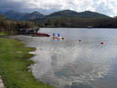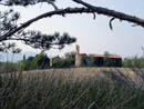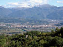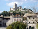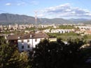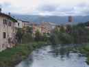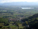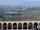 Il faut passer par dessus ce mur, et traverser le ruisseau qui mène au lac. De l'autre côté un pêcheur impassible nous observe! Nous faisons une pause avant de remonter à travers un champ labouré, et retrouver une route goudronnée. Françoise me parle de sa vie, et de ses problèmes... comme si c'était le moment! On ne sait pas où on est, et combien de temps avant de trouver un village! Nous marchons sur cette route jusqu'au pont ; elle commence à ralentir le pas, et à être fatiguée! Elle me demande de continuer à mon rythme, ce que je fais! Au bout d'un moment, je ne la vois plus derrière! je m'arrête et j'attends un bon quart d'heure! Elle arrive tout doucement. Nous tentons le stop sans succès pendant longtemps. Une voiture quand même s'arrête, nous n'y croyons pas! Ils peuvent nous emmener à Anghiari qui se trouve à cinq ou six kilomètres, c'est toujours çà en moins! Nous traversons le village d'Anghiari à pied, et au bout d'une longue route toute droite nous apercevons Sansepolcro. Nous reprenons le stop! Quelques minutes plus tard, une voiture s'arrête, et nous prend! Nous arrivons enfin à Sansepolcro à 17h30 : petite ville très animée. Je n'ose pas imaginé l'heure d'arrivée si nous n'avions pas fait de stop!... Notre chauffeur insiste pour nous payer à boire! Françoise préfère l'hôtel dans le centre ville. Moi je choisi d'aller chez les Cappuccini, sans être certain d'y être hébergé. Notre chauffeur m'y emmène à pied : un bon quart d'heure par des routes qui grimpent au dessus de la ville!