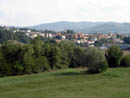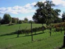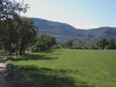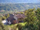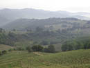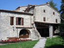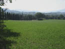 Il y a un village de l'autre côté et une route au loin. Nous descendons, pour nous retrouver dans un bosquet sans aucune trace, des buissons, des branchages. Nous arrivons devant un ruisseau qu'il faut traverser à gué ; sur l'autre rive encore des broussailles. Je commence à avoir des égratignures : je suis en short! Françoise ne se plaint de rien : elle est couverte. Enfin arrivés dans une clairière, nous passons par un agritourisme. Les sympathiques propriétaires nous apprennent que nous sommes près de Caprese di Michelangelo, village natal de Michel Ange. Il est plus de midi, on nous propose de manger quelque chose ; Françoise se laisserait bien tenter, mais moi je préfère continuer, ne sachant même pas combien de temps il nous reste pour atteindre Sansepolcro village étape.