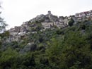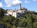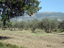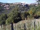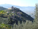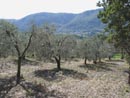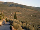 Je passe au creux d'un très beau vallon entouré d'oliviers. En haut d'une colline à gauche, je distingue quelques maisons un peu cachées par les bois, mais en avançant le village se découvre petit à petit. Il faut contourner une grande partie forestière, avec quantité de noix à ramasser au sol. A une intersection, la pancarte "Via Francigena, Cammino di San Francesco" indique d'aller tout droit. Je préfère prendre à gauche pour monter directement dans le village. La pente est très raide! Une fois en haut, aucune indication pour savoir où on est! J'apprends par une habitante que ce village est Montelibretti.... très heureux de le savoir puisque c'est ici que je voulais venir!