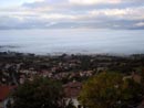 Face à la Basilique, le soleil disparaît derrière la brume et les collines.